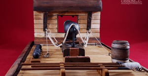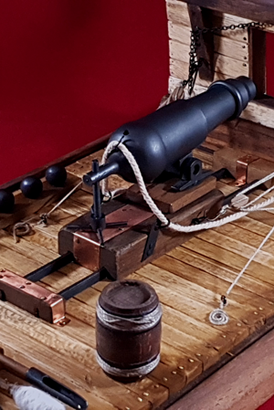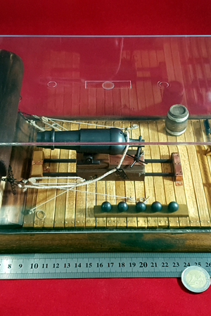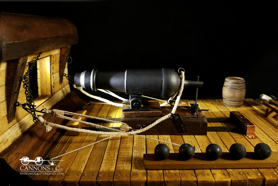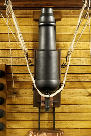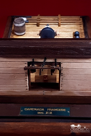This 36-pound Caronade was built by the French following the style of the English version, developed over a century before. The screwed sight, the stronger breech & slider carriage running on a track, made the French caronade more efficient. The gun was placed into the first and second rate vessels like the “Toulonnaise”, “La Belle Poule” and the “Valmy/