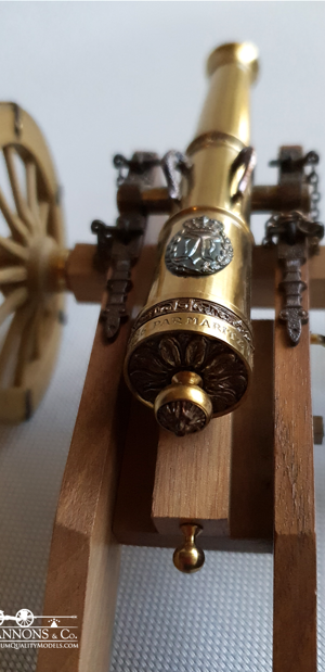 This is a model of French cannon built in 1736, (should be under King Louis XV and not XIV) with siege carriage and complete with ammunition case and rod for moving the carriage for the direction aim. The inscription in the barrell breech shows the name of the swiss manufacturer, Jean Maritz I (1680 - 1743), the first to bore out the Model 1732 system equipments. These standardized pieces became known as the “Vallière System”.