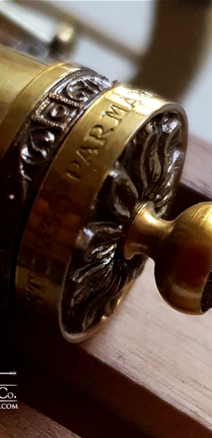 In its shining, flowless excellent mint condition, complete with all the original accessories, this beautiful piece of art has been masterfully crafted and assembled by Maestro Arnaldo Pocher from the goldsmith school. As it can be seen, the ability to make the brass finish in different colors makes it a true jewelry product. This work of art is extremely rare and is one of the very first that were produced in 1962 and were sold pre-assembled.