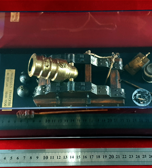 A fine exhibition standard 1:15 scale in brass, wood and iron. A massive looking but exquisitely crafted exhibition model with gunner's linstock matchholder, a realistic brazier, levers, mallet, a black powder-filled bombs and a selection of instruments. Based on a Mantua kit, this model has been modified to match a more historically accurate representation of a late XVII centurysiege mortar.