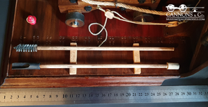 An outstanding quality museum large scale cannon, depicting a 12-pounder naval gun in early 18th Century "combat station". This model is a unique, entirely scratch built by a skilled Italian artisan, Augusto Ubaldini with the cooperation of Ugo Crisponi. The workmanship is of very high quality making it an exceptional collector piece. The heavy barrel is milled from a solid C40 / 1.0511 non-alloy quality steel with medium-high carbon content and low hardenability, as well as all components, finely machined. The smooth walnut wood carriage is nicely detailed with an aged finish to the wood. Rope recoil fitments are done very nicely and to scale. The simulated deck with the proper accessories adds a nice attention to detail on this model. Scale 1:10. Size of the cannon is 27x13x10(H)cm weight 1.700 Kgs. The basement is 33cm in lenght.