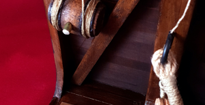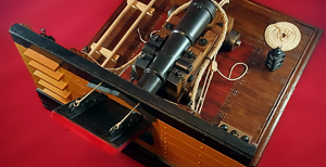 This huge model replicates the type that was used by the British Royal Navy during the 18th and early 19th Centuries on the gun decks of Ship’s of the Line in typical ochre and black color of the hull and red gunport. Complete with port rods, and functional ropes for raising and retaining lids in the open position.